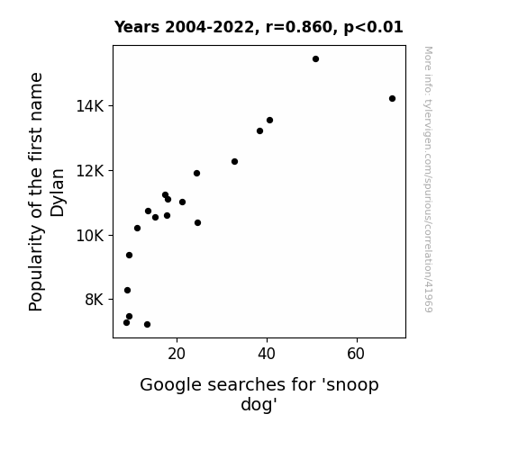 This means 73.9% of the change in the one variable (i.e., Google searches for 'snoop dog') is predictable based on the change in the other (i.e., Popularity of the first name Dylan) over the 19 years from 2004 through 2022.
