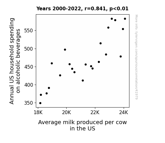 This means 70.8% of the change in the one variable (i.e., Average milk produced per cow in the US) is predictable based on the change in the other (i.e., Annual US household spending on alcoholic beverages) over the 23 years from 2000 through 2022.