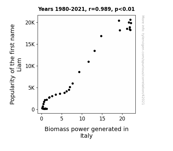This means 97.9% of the change in the one variable (i.e., Biomass power generated in Italy) is predictable based on the change in the other (i.e., Popularity of the first name Liam) over the 42 years from 1980 through 2021.