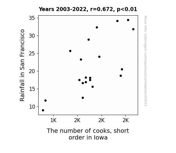 This means 45.2% of the change in the one variable (i.e., The number of cooks, short order in Iowa) is predictable based on the change in the other (i.e., Rainfall in San Francisco) over the 20 years from 2003 through 2022.
