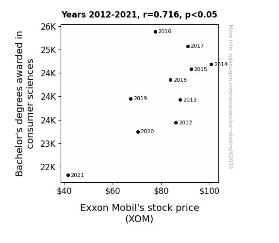 This means 51.3% of the change in the one variable (i.e., Exxon Mobil's stock price (XOM)) is predictable based on the change in the other (i.e., Bachelor's degrees awarded in consumer sciences) over the 10 years from 2012 through 2021.