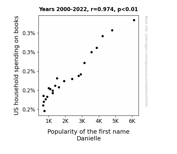 This means 94.9% of the change in the one variable (i.e., Popularity of the first name Danielle) is predictable based on the change in the other (i.e., US household spending on books) over the 23 years from 2000 through 2022.