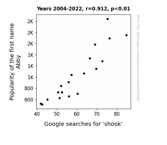 This means 83.1% of the change in the one variable (i.e., Google searches for 'shook') is predictable based on the change in the other (i.e., Popularity of the first name Abby) over the 19 years from 2004 through 2022.