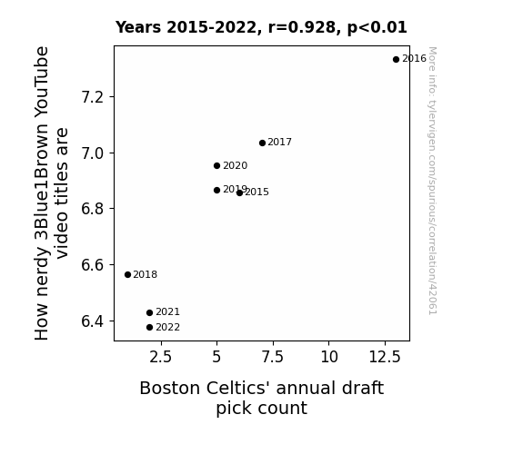 This means 86.2% of the change in the one variable (i.e., Boston Celtics' annual draft pick count) is predictable based on the change in the other (i.e., How nerdy 3Blue1Brown YouTube video titles are) over the 8 years from 2015 through 2022.