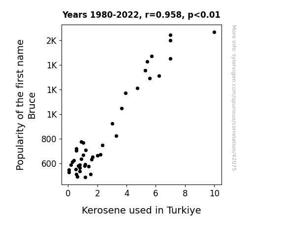 This means 91.7% of the change in the one variable (i.e., Kerosene used in Turkiye) is predictable based on the change in the other (i.e., Popularity of the first name Bruce) over the 43 years from 1980 through 2022.