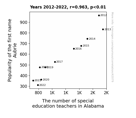 This means 92.8% of the change in the one variable (i.e., The number of special education teachers in Alabama) is predictable based on the change in the other (i.e., Popularity of the first name Aubrie) over the 11 years from 2012 through 2022.
