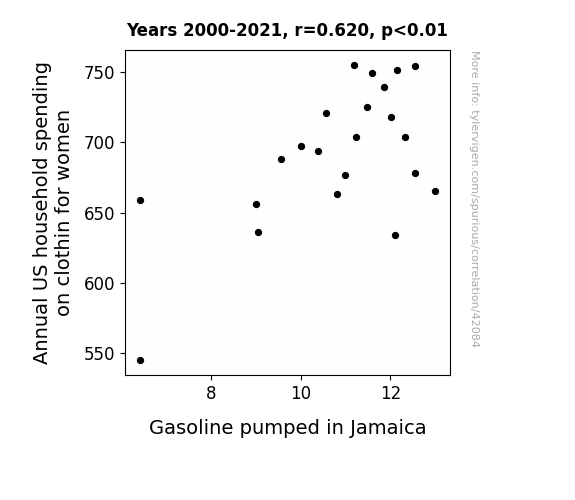 This means 38.5% of the change in the one variable (i.e., Gasoline pumped in Jamaica) is predictable based on the change in the other (i.e., Annual US household spending on clothin for women) over the 22 years from 2000 through 2021.