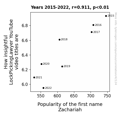 This means 83.1% of the change in the one variable (i.e., Popularity of the first name Zachariah) is predictable based on the change in the other (i.e., How insightful LockPickingLawyer YouTube video titles are) over the 8 years from 2015 through 2022.