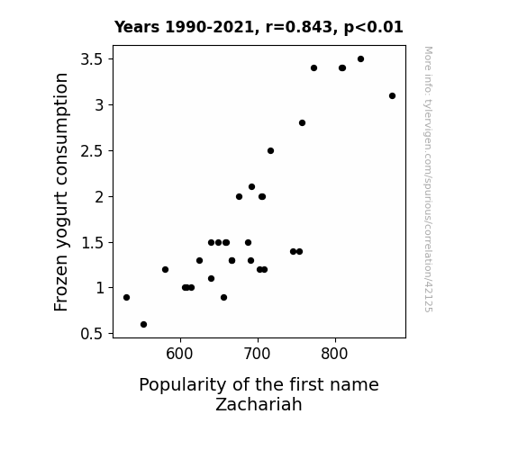 This means 71.1% of the change in the one variable (i.e., Popularity of the first name Zachariah) is predictable based on the change in the other (i.e., Frozen yogurt consumption) over the 32 years from 1990 through 2021.