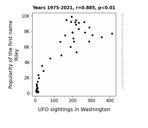 This means 78.3% of the change in the one variable (i.e., UFO sightings in Washington) is predictable based on the change in the other (i.e., Popularity of the first name Riley) over the 47 years from 1975 through 2021.