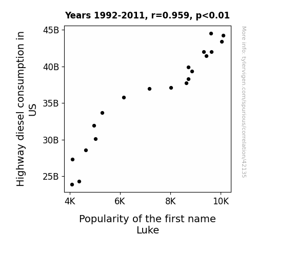 This means 92.1% of the change in the one variable (i.e., Popularity of the first name Luke) is predictable based on the change in the other (i.e., Highway diesel consumption in US) over the 20 years from 1992 through 2011.