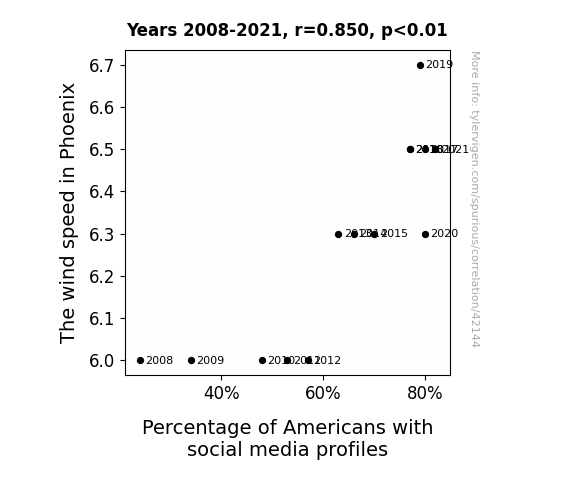 This means 72.3% of the change in the one variable (i.e., Percentage of Americans with social media profiles) is predictable based on the change in the other (i.e., The wind speed in Phoenix) over the 14 years from 2008 through 2021.