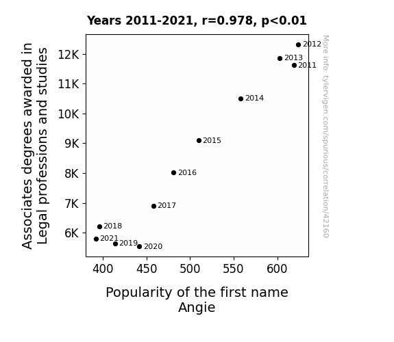 This means 95.7% of the change in the one variable (i.e., Popularity of the first name Angie) is predictable based on the change in the other (i.e., Associates degrees awarded in Legal professions and studies) over the 11 years from 2011 through 2021.