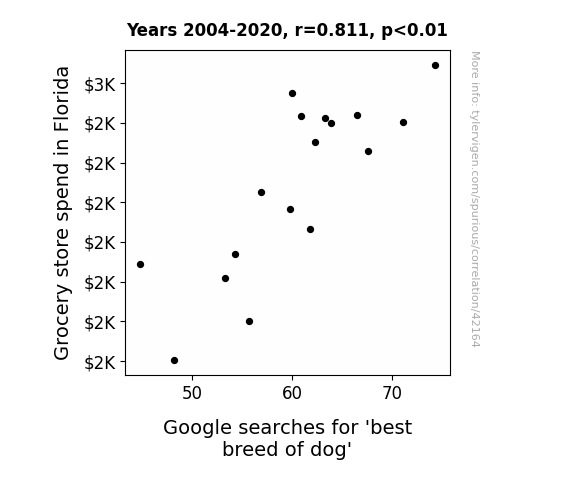 This means 65.8% of the change in the one variable (i.e., Google searches for 'best breed of dog') is predictable based on the change in the other (i.e., Grocery store spend in Florida) over the 17 years from 2004 through 2020.