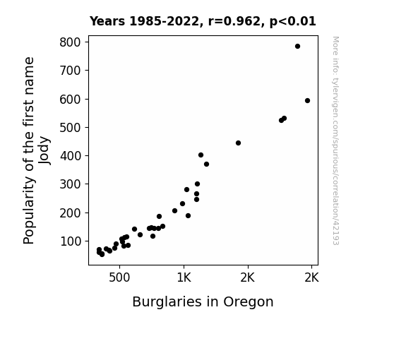 This means 92.6% of the change in the one variable (i.e., Burglaries in Oregon) is predictable based on the change in the other (i.e., Popularity of the first name Jody) over the 38 years from 1985 through 2022.