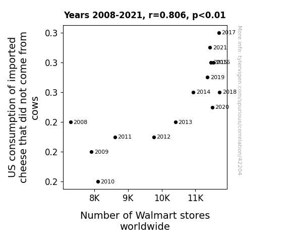 This means 65% of the change in the one variable (i.e., Number of Walmart stores worldwide) is predictable based on the change in the other (i.e., US consumption of imported cheese that did not come from cows) over the 14 years from 2008 through 2021.