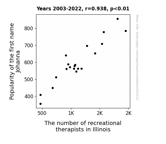 This means 88% of the change in the one variable (i.e., The number of recreational therapists in Illinois) is predictable based on the change in the other (i.e., Popularity of the first name Johanna) over the 20 years from 2003 through 2022.