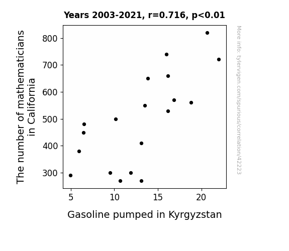 This means 51.2% of the change in the one variable (i.e., Gasoline pumped in Kyrgyzstan) is predictable based on the change in the other (i.e., The number of mathematicians in California) over the 19 years from 2003 through 2021.