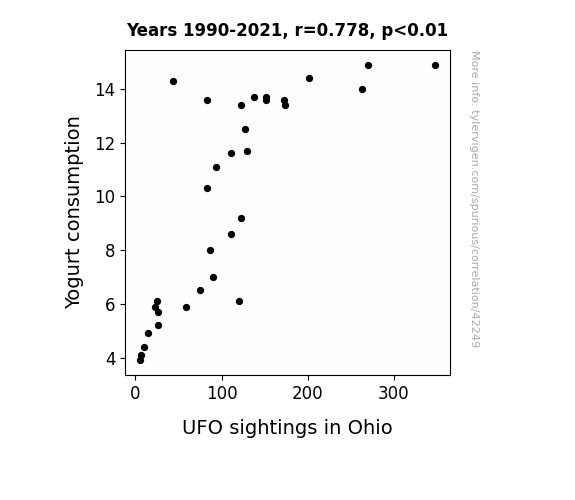 This means 60.5% of the change in the one variable (i.e., UFO sightings in Ohio) is predictable based on the change in the other (i.e., Yogurt consumption) over the 32 years from 1990 through 2021.