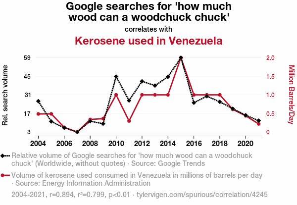- The spurious research paper: How Much Kerosene for a Woodchuck Spleen: The Correlation Between Google Searches for 'How Much Wood Can a Woodchuck Chuck' and Kerosene Usage in Venezuela