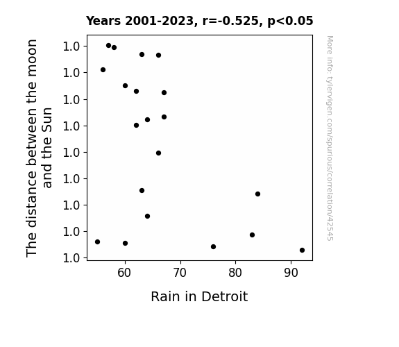 This means 27.5% of the change in the one variable (i.e., Rain in Detroit) is predictable based on the change in the other (i.e., The distance between the moon and the Sun) over the 20 years from 2001 through 2023.