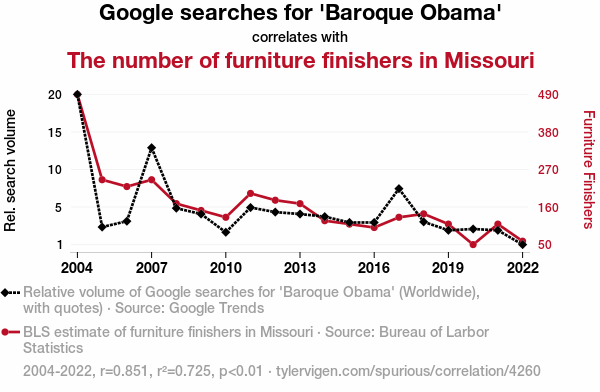 Baroque Obama, Google search trends, furniture finishers employment, Missouri, statistical analysis, correlation coefficient, art history, labor market, data analysis, Bureau of Labor Statistics, humor in research, Google Trends, historical art movement