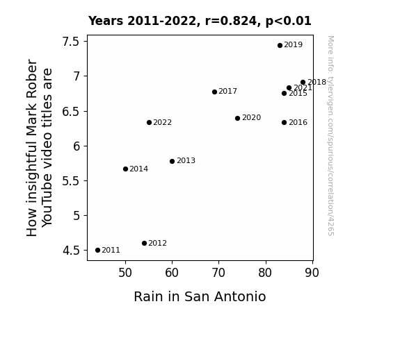 - The spurious research paper: Rain or Shine: Mark Rober's YouTube Titles Forecasting Precipitation in San Antonio