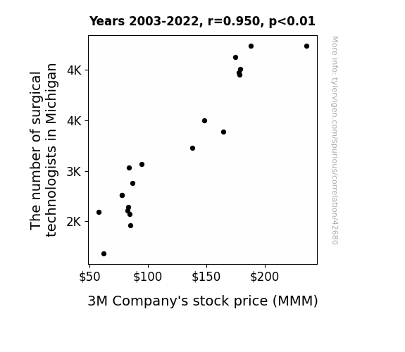 This means 90.3% of the change in the one variable (i.e., 3M Company's stock price (MMM)) is predictable based on the change in the other (i.e., The number of surgical technologists in Michigan) over the 20 years from 2003 through 2022.