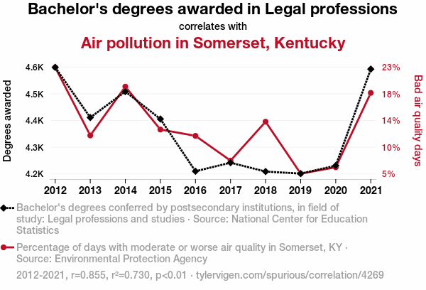 This means 73% of the change in the one variable (i.e., Air pollution in Somerset, Kentucky) is predictable based on the change in the other (i.e., Bachelor's degrees awarded in Legal professions) over the 10 years from 2012 through 2021.