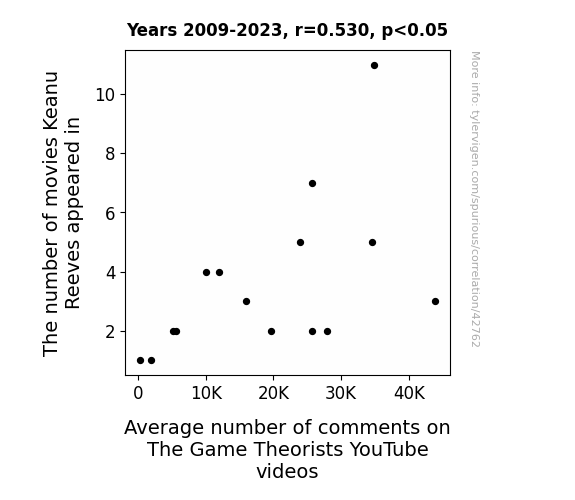 This means 28.1% of the change in the one variable (i.e., Average number of comments on The Game Theorists YouTube videos) is predictable based on the change in the other (i.e., The number of movies Keanu Reeves appeared in) over the 15 years from 2009 through 2023.
