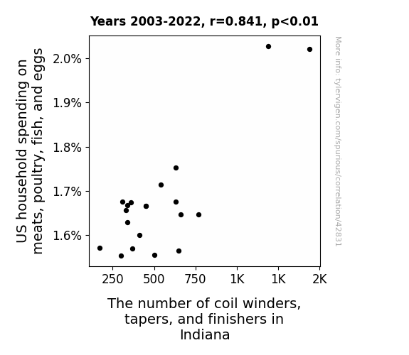 This means 70.7% of the change in the one variable (i.e., The number of coil winders, tapers, and finishers in Indiana) is predictable based on the change in the other (i.e., US household spending on meats, poultry, fish, and eggs) over the 20 years from 2003 through 2022.