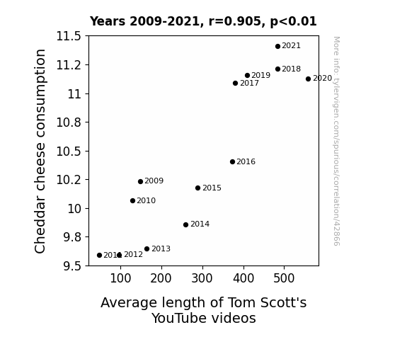 This means 81.9% of the change in the one variable (i.e., Average length of Tom Scott's YouTube videos) is predictable based on the change in the other (i.e., Cheddar cheese consumption) over the 13 years from 2009 through 2021.