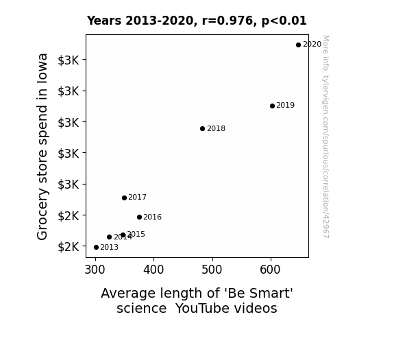This means 95.2% of the change in the one variable (i.e., Average length of 'Be Smart' science YouTube videos) is predictable based on the change in the other (i.e., Grocery store spend in Iowa) over the 8 years from 2013 through 2020.