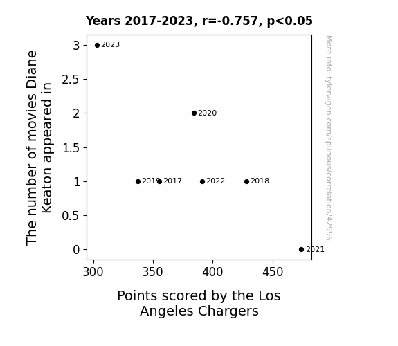 This means 57.4% of the change in the one variable (i.e., Points scored by the Los Angeles Chargers) is predictable based on the change in the other (i.e., The number of movies Diane Keaton appeared in) over the 7 years from 2017 through 2023.