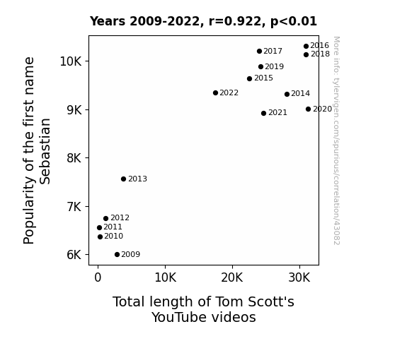 This means 84.9% of the change in the one variable (i.e., Total length of Tom Scott's YouTube videos) is predictable based on the change in the other (i.e., Popularity of the first name Sebastian) over the 14 years from 2009 through 2022.