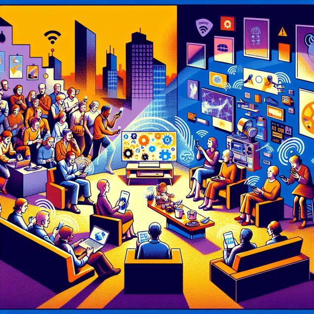 ChatGPT: Prompt: Create an image inspired by Bauhaus, depicting a bustling city where people excitedly unbox and activate their new iPhones. Meanwhile, in a cozy living room, friends gather around a laptop, watching an AsapSCIENCE video. As the iPhone users engage with their new devices, a subtle shift occurs in the room, and the viewers' faces light up with intrigue and enthusiasm, resulting in a surge of likes on the AsapSCIENCE video. The electromagnetic waves and the engaging science content merge, creating an unexpected and captivating visual connection.