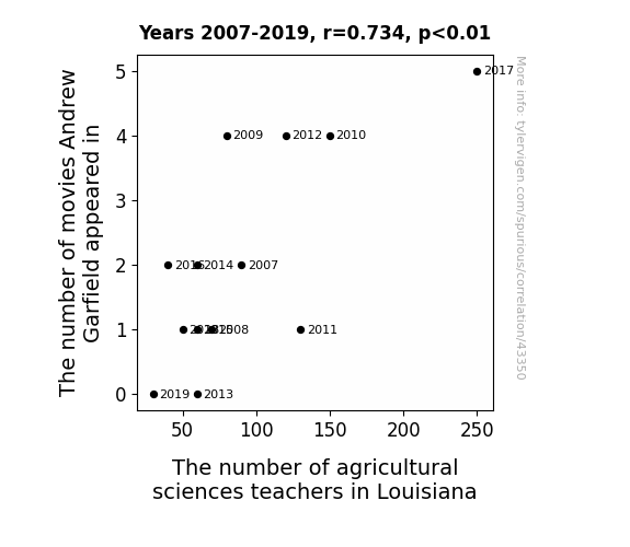 This means 53.8% of the change in the one variable (i.e., The number of agricultural sciences teachers in Louisiana) is predictable based on the change in the other (i.e., The number of movies Andrew Garfield appeared in) over the 13 years from 2007 through 2019.