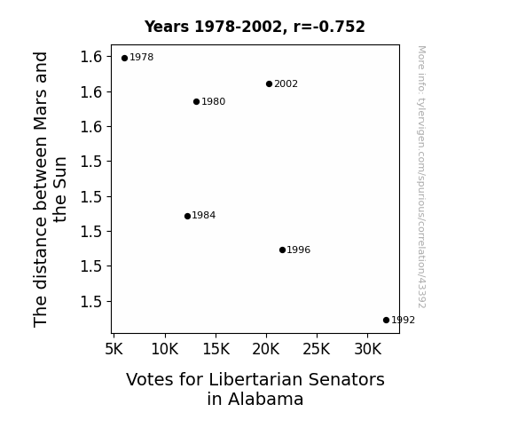 This means 56.5% of the change in the one variable (i.e., Votes for Libertarian Senators in Alabama) is predictable based on the change in the other (i.e., The distance between Mars and the Sun) over the 6 years from 1978 through 2002.