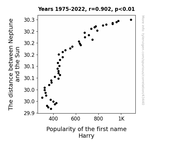 This means 81.4% of the change in the one variable (i.e., Popularity of the first name Harry) is predictable based on the change in the other (i.e., The distance between Neptune and the Sun) over the 48 years from 1975 through 2022.
