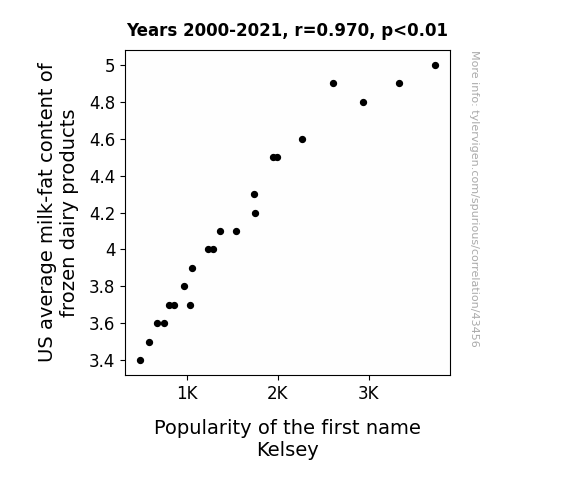 This means 94.2% of the change in the one variable (i.e., Popularity of the first name Kelsey) is predictable based on the change in the other (i.e., US average milk-fat content of frozen dairy products) over the 22 years from 2000 through 2021.