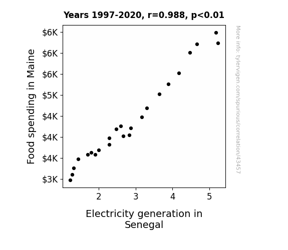 This means 97.6% of the change in the one variable (i.e., Electricity generation in Senegal) is predictable based on the change in the other (i.e., Food spending in Maine) over the 24 years from 1997 through 2020.