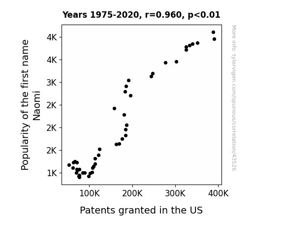 This means 92.2% of the change in the one variable (i.e., Patents granted in the US) is predictable based on the change in the other (i.e., Popularity of the first name Naomi) over the 46 years from 1975 through 2020.