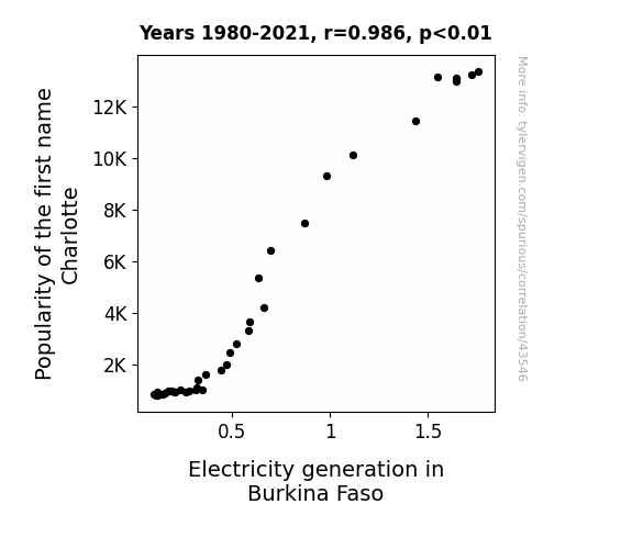 This means 97.2% of the change in the one variable (i.e., Electricity generation in Burkina Faso) is predictable based on the change in the other (i.e., Popularity of the first name Charlotte) over the 42 years from 1980 through 2021.