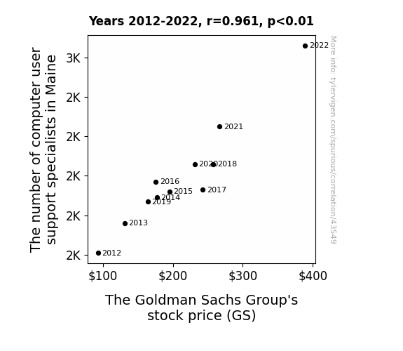 This means 92.3% of the change in the one variable (i.e., The Goldman Sachs Group's stock price (GS)) is predictable based on the change in the other (i.e., The number of computer user support specialists in Maine) over the 11 years from 2012 through 2022.