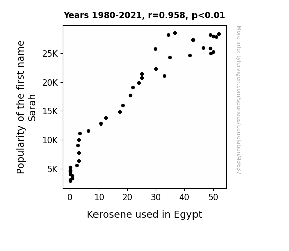 This means 91.7% of the change in the one variable (i.e., Kerosene used in Egypt) is predictable based on the change in the other (i.e., Popularity of the first name Sarah) over the 42 years from 1980 through 2021.