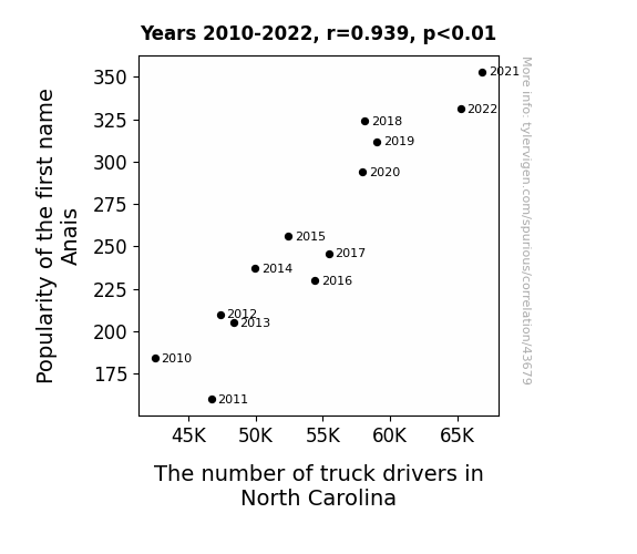 This means 88.1% of the change in the one variable (i.e., The number of truck drivers in North Carolina) is predictable based on the change in the other (i.e., Popularity of the first name Anais) over the 13 years from 2010 through 2022.