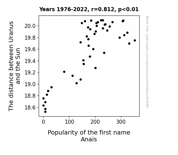 This means 65.9% of the change in the one variable (i.e., Popularity of the first name Anais) is predictable based on the change in the other (i.e., The distance between Uranus and the Sun) over the 47 years from 1976 through 2022.