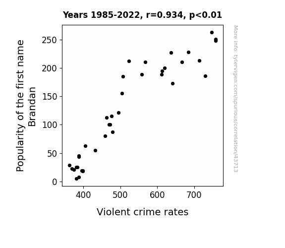 This means 87.2% of the change in the one variable (i.e., Violent crime rates) is predictable based on the change in the other (i.e., Popularity of the first name Brandan) over the 38 years from 1985 through 2022.