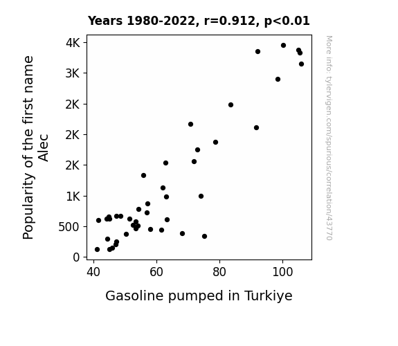 This means 83.1% of the change in the one variable (i.e., Gasoline pumped in Turkiye) is predictable based on the change in the other (i.e., Popularity of the first name Alec) over the 43 years from 1980 through 2022.