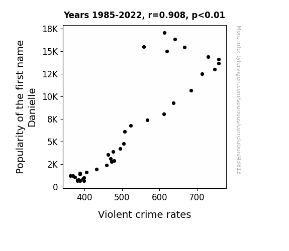 This means 82.4% of the change in the one variable (i.e., Violent crime rates) is predictable based on the change in the other (i.e., Popularity of the first name Danielle) over the 38 years from 1985 through 2022.